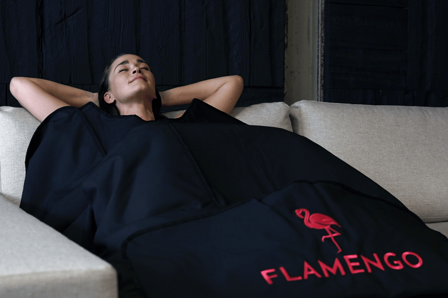 Tragen Sie bequeme Baumwollkleidung. Möchten Sie lieber ohne Kleidung auskommen? Dann verwenden Sie die Handtucheinlage Flamengo. Anschließend legen Sie sich in die Flamengo-Infrarotdecke und verschließen die Decke mit dem Klettverschluss. Auch die Schultern sind mit den Schulterbezügen bedeckt.